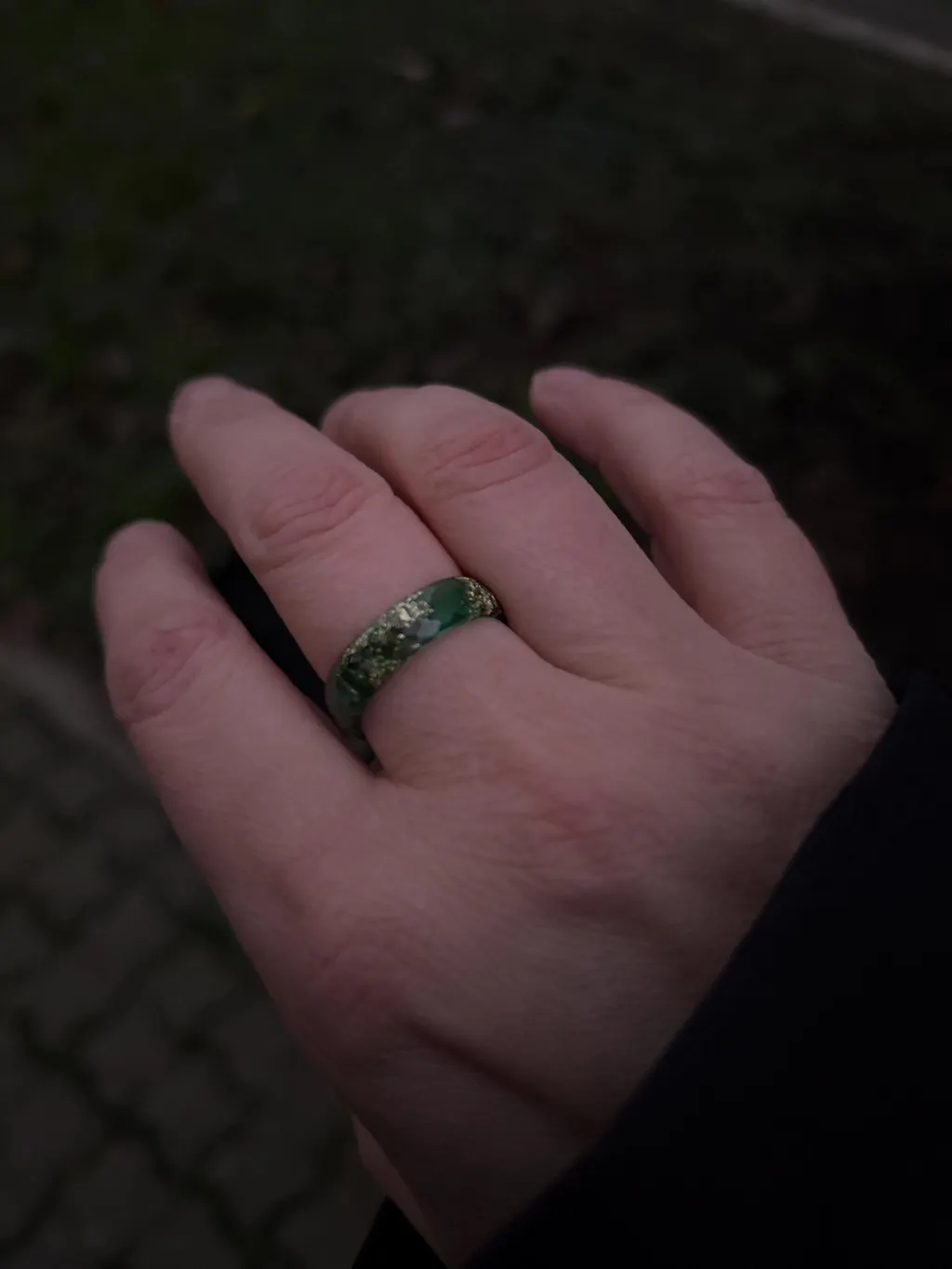 Designed as a modern alternative to metal, this ring is lightweight, smooth, skin-safe, and comfortable for everyday wear. Its deep forest tone and golden shimmer bring earthy elegance to both casual and elevated looks — striking yet effortlessly wearable.