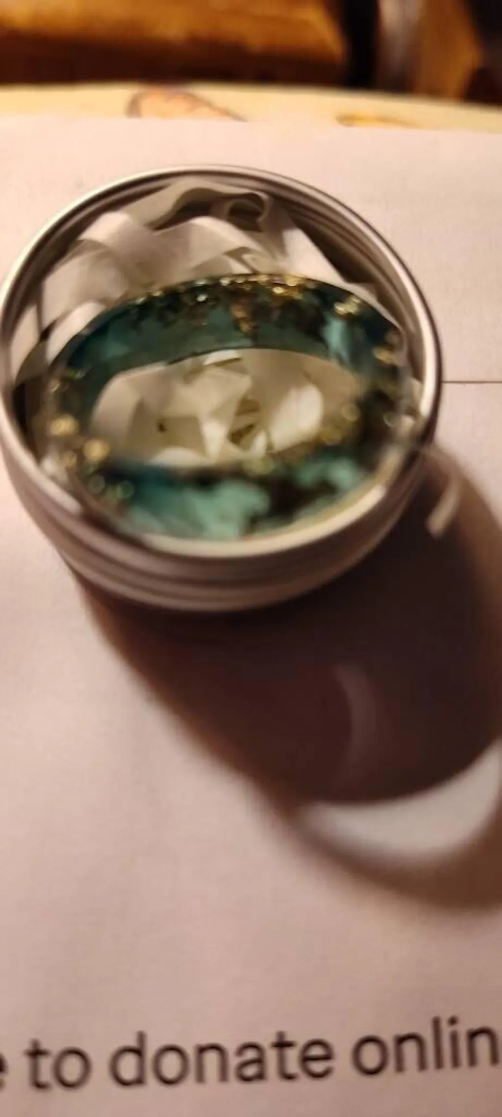 The Deep Grove Ring is hand-cast from hand-pigmented emerald-green resin infused with shimmering metallic gold flakes, creating rich depth and warm light suspended in glass-like clarity. Crafted in a 6 mm faceted band, the sculpted surface catches light with every movement — lush, modern, and quietly powerful.